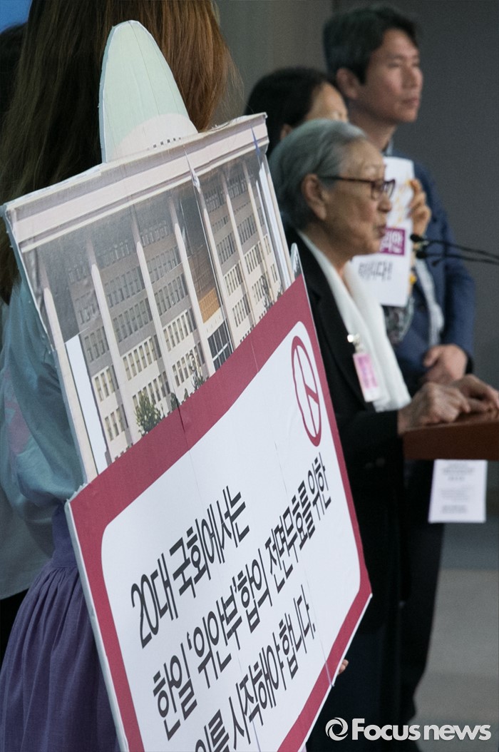 (서울=포커스뉴스) 26일 오전 서울 여의도 국회 정론관에서 홍익표, 이인영 더불어민주당 의원과 윤미향 한국정신대문제대책협의회 상임대표, 위안부 피해자 김복동 할머니 등이 한일 일본군 '위안부' 합의 무효 및 재협상을 위한 20대 국회의 역할 촉구 기자회견을 하고 있다.