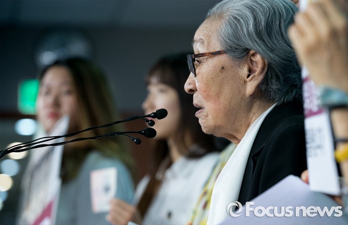 (서울=포커스뉴스) 26일 오전 서울 여의도 국회 정론관에서 홍익표, 이인영 더불어민주당 의원과 윤미향 한국정신대문제대책협의회 상임대표, 위안부 피해자 김복동 할머니 등이 한일 일본군 '위안부' 합의 무효 및 재협상을 위한 20대 국회의 역할 촉구 기자회견을 하고 있다.