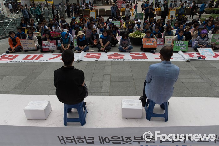 (서울=포커스뉴스) 26일 오전 서울시청 정문앞에서 전국장애인 부모연대와 서울특수학교학부모협의회원들이 발달장애인 정책 수립을 촉구하며 삭발식을 하고 있다.