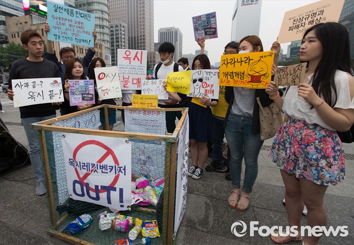 (서울=포커스뉴스) 26일 오후 서울 광화문광장에서 성공회대 학생모임과 청년참여연대 관계자들이 옥시 제품 불매 동참 선언 퍼포먼스를 펼치고 있다.