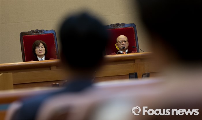 (서울=포커스뉴스) 26일 오후 서울 종로구 헌법재판소 대심판정에서 박한철 헌법재판소장이 국회선진화법 권한쟁의 심판 선고 및 통합진보당 해산결정 재심 선고를 위해 입장하고 있다.