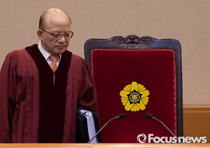 (서울=포커스뉴스) 26일 오후 서울 종로구 헌법재판소 대심판정에서 박한철 헌법재판소장이 국회선진화법 권한쟁의 심판 선고 및 통합진보당 해산결정 재심 선고를 위해 입장하고 있다.