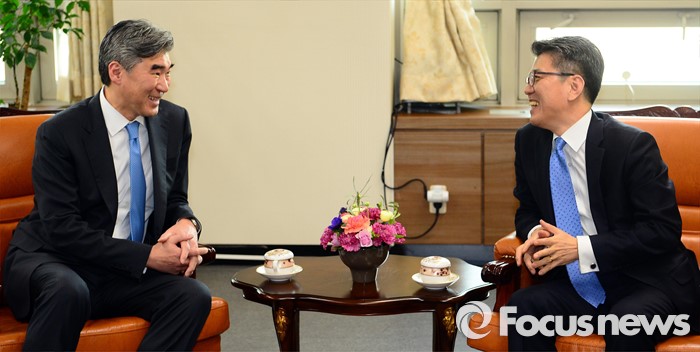 외교부는 "김형진 차관보의 이번 방중은 한반도 및 동북아 현안 관련 양국 간 전략적 소통을 강화하고, 동북아평화협력구상에 대한 중국 조야의 인식을 제고하는 좋은 기회가 될 것으로 기대한다"고 말했다.한·미·일 6자회담 수석대표 협의가 6월1일 일본 동경에서 열린다. 사진은 3월22일 서울 종로구 외교부에서 열린 '한·미 북핵 6자회담' 당시 성김(왼쪽) 미국 국무부 대북정책특별대표와 김홍균 한반도평화교섭본부장. 2016.03.22 조종원 기자