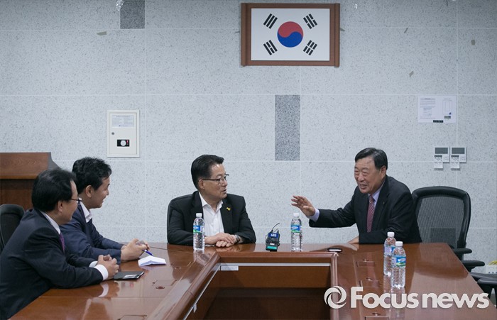 (서울=포커스뉴스) 박지원(왼쪽 세번째) 국민의당 원내대표가 26일 오후 서울 여의도 국회 의원회관에서 이희범(오른쪽) 평창동계올림픽 조직위원장과 만나 면담을 하고 있다.