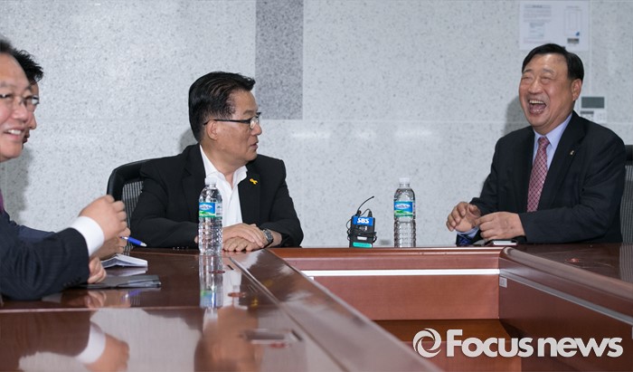 (서울=포커스뉴스) 박지원(가운데) 국민의당 원내대표가 26일 오후 서울 여의도 국회 의원회관에서 이희범(오른쪽) 평창동계올림픽 조직위원장과 만나 면담을 하고 있다.
