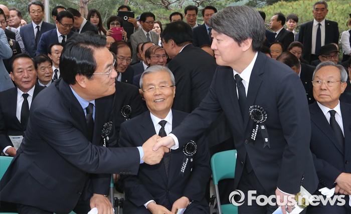 (서울=포커스뉴스)26일 오후 서울 동작구 국립현충원에서 열린 고 김영삼 전 대통령 묘비 제막식에서 정진석 새누리당 원내대표와 안철수 국민의당 대표가 인사를 나누고 있다.