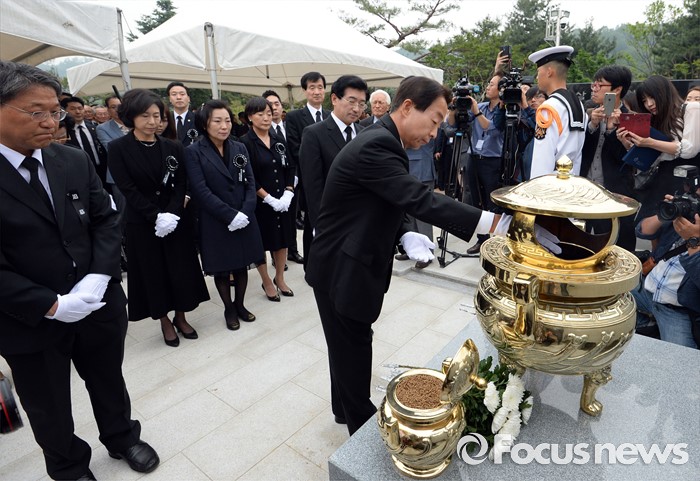 (서울=포커스뉴스) 26일 오후 서울 동작구 국립현충원에서 열린 고 김영삼 전 대통령 묘비 제막식에서 차남 김현철씨를 비롯한 가족들이 참배를 하고 있다.