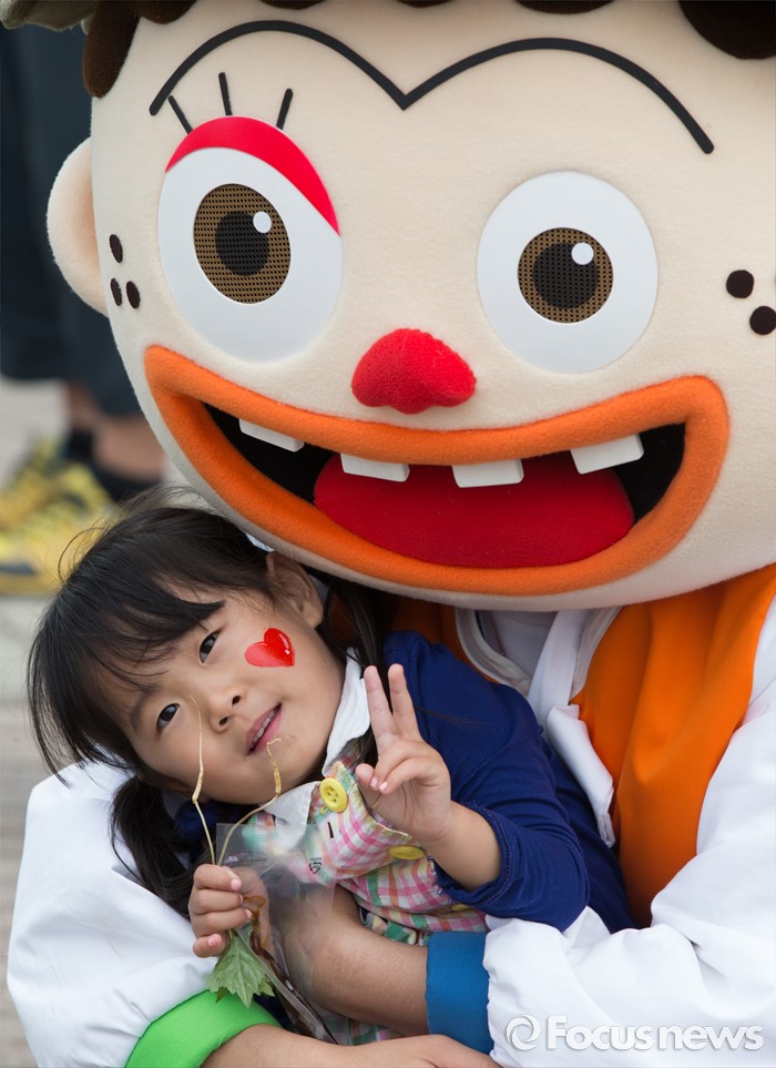 (음성=포커스뉴스) 26일 충북 음성군 음성읍 설성공원 일원에서 제17회 음성 품바축제가 열린 가운데 어린이가 품바캐릭터와 기념촬영을 하고 있다.