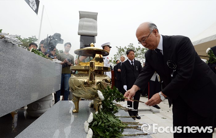 (서울=포커스뉴스) 벳쇼 고로 주한일본대사가 26일 오후 서울 동작구 국립현충원에서 열린 故 김영삼 전 대통령 묘비 제막식에 참석해 헌화를 하고 있다.