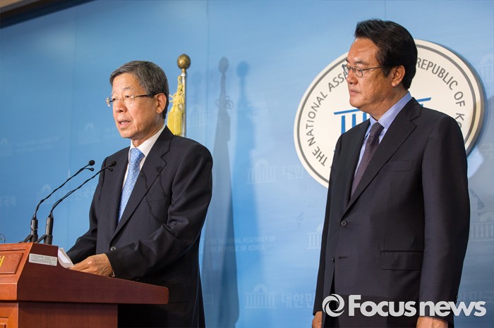 (서울=포커스뉴스) 새누리당 임시지도부인 혁신비상대책위원회 위원장에 내정된 김희옥(왼쪽) 전 정부공직자윤리위원장이 26일 오후 서울 여의도 국회에서 혁신비대위 계획을 발표 하고 있다. 사진 오른쪽은 정진석 새누리당 원내대표.