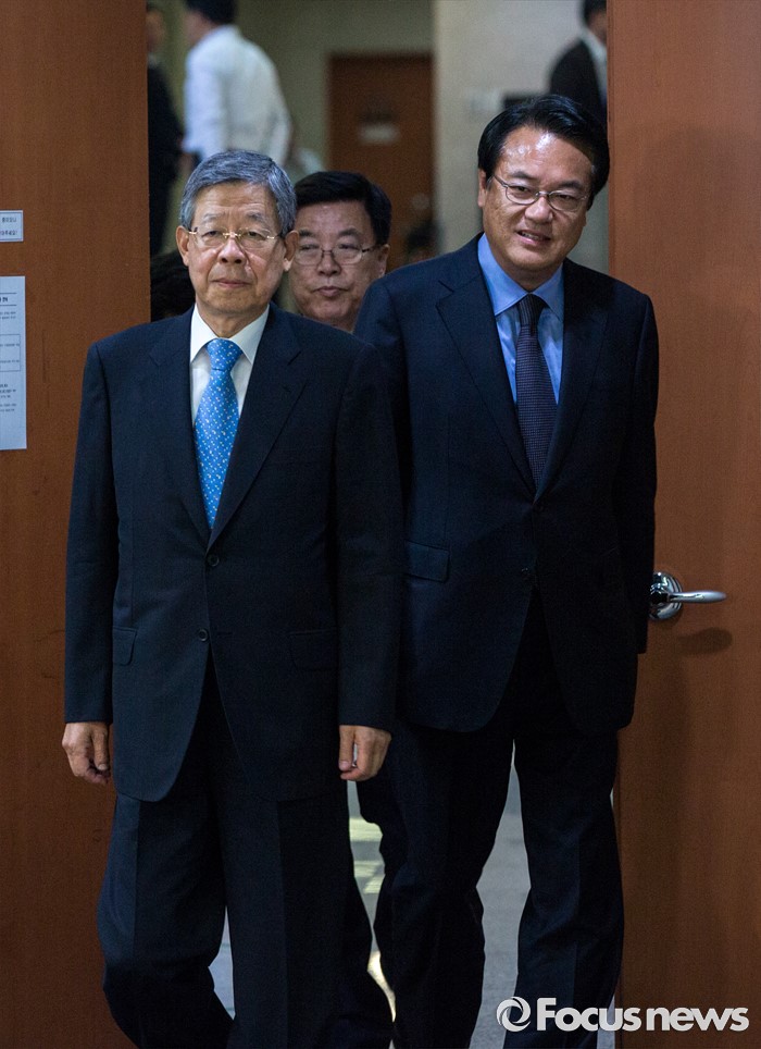 (서울=포커스뉴스) 새누리당 임시지도부인 혁신비상대책위원회 위원장에 내정된 김희옥(왼쪽) 전 정부공직자윤리위원장과 정진석 새누리당 원내대표가 26일 오후 서울 여의도 국회에서 혁신비대위 계획을 발표 하기 위해 기자회견장으로 들어서고 있다.