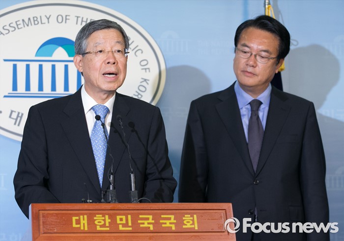 (서울=포커스뉴스) 새누리당 혁신비대위원장에 내정된 김희옥(왼쪽) 전 동국대 총장과 정진석 원내대표가 26일 오후 서울 여의도 국회 정론관에서 기자회견을 하고 있다.