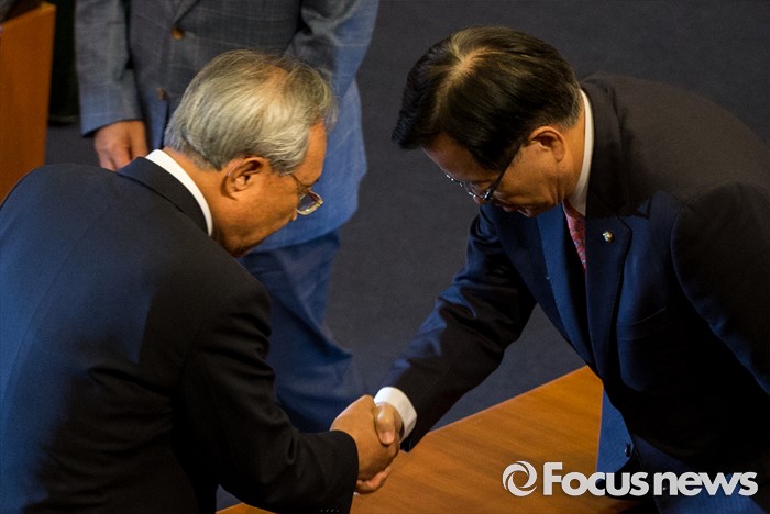 (서울=포커스뉴스) 26일 오후 서울 여의도 국회 헌정기념관에서 열린 '새한국의 비전' 창립 기념식에 참석한 정의화(오른쪽) 국회의장과 박관용 전 국회의장이 악수하고 있다.