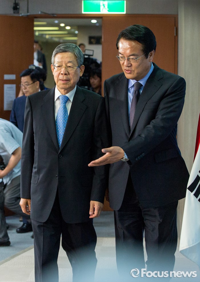 (서울=포커스뉴스) 새누리당 임시지도부인 혁신비상대책위원회 위원장에 내정된 김희옥(왼쪽) 전 정부공직자윤리위원장과 정진석 새누리당 원내대표가 26일 오후 서울 여의도 국회에서 혁신비대위 계획을 발표 하기 위해 기자회견장으로 들어서고 있다.