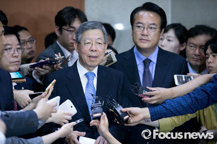 (서울=포커스뉴스) 새누리당 혁신비대위원장에 내정된 김희옥(왼쪽) 전 동국대 총장과 정진석 원내대표가 26일 오후 서울 여의도 국회 정론관에서 기자회견을 마친 뒤 취재진 질문에 답하고 있다.