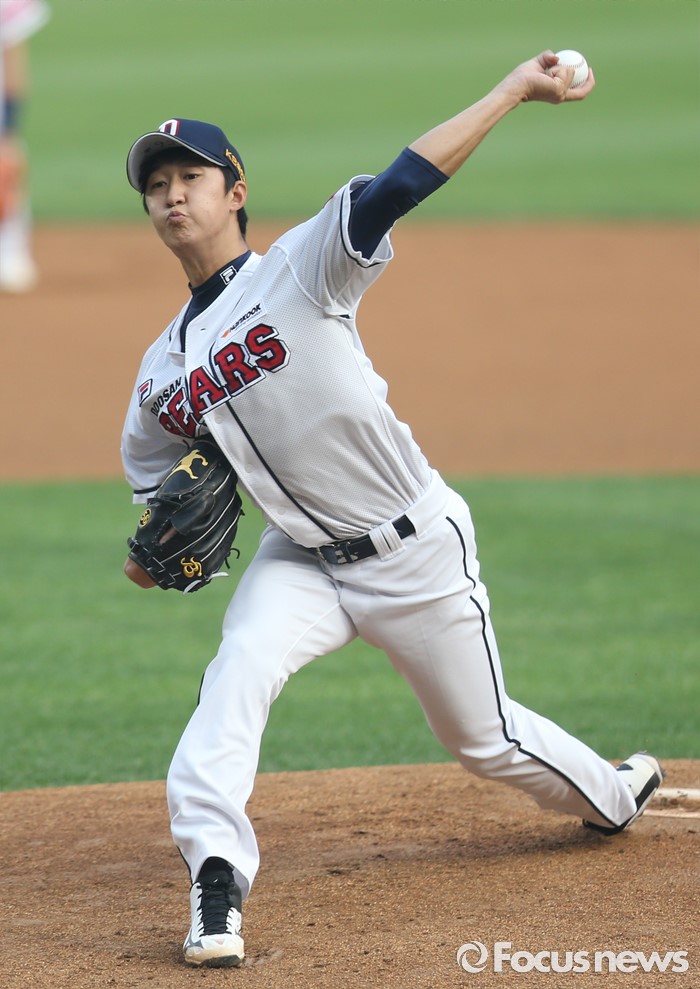 (서울=포커스뉴스) 26일 서울 잠실구장에서 열린 2016프로야구 kt-두산 경기에서 1회초 두산 선발투수 허준혁이 투구하고 있다.