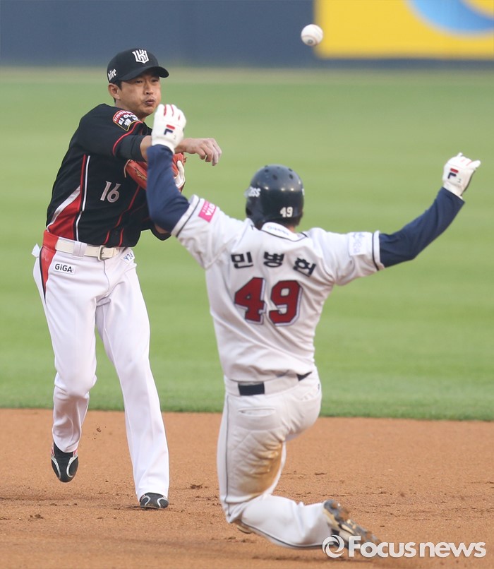 (서울=포커스뉴스) 26일 서울 잠실구장에서 열린 2016프로야구 kt-두산 경기 1회말 1사 1루에서 두산 오재일의 2루 땅볼때 1루주자 민병헌이 2루에서 포스아웃되고 있다. kt 유격수 박기혁이 1루로 송구해 더블플레이 성공.
