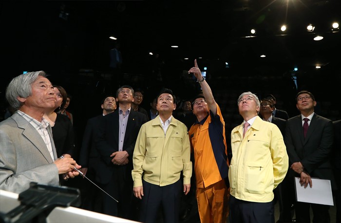(서울=포커스뉴스) 26일 서울 대학로에 위치한 소극장에서 문화체육관광부와 국민안전처가 서울시·공연장안전지원센터·한국소극장협회 등 민관 합동으로 공연장 안전관리 실태에 대해 현장점검을 실시했다. 이날 김종덕 문체부 장관, 박인용 국민안전처 장관이 소극장 안전관리 실태를 점검하고 있다. <사진제공=문화체육관광부>