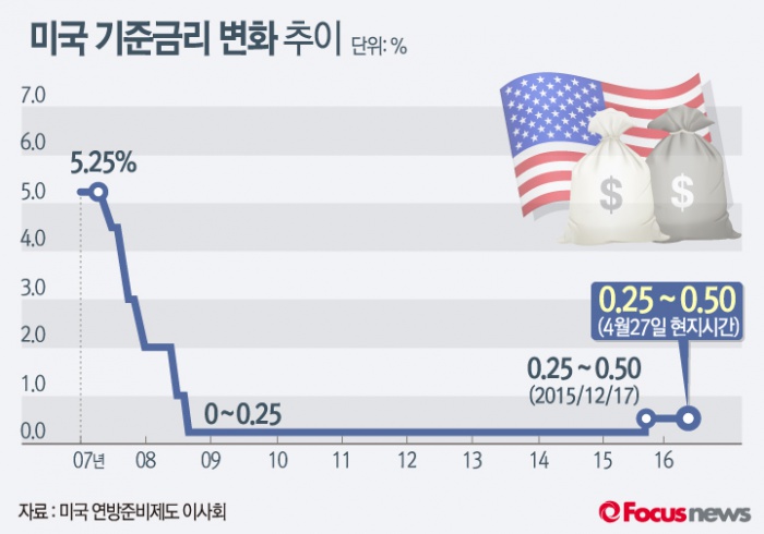 한편 미국 연방준비제도(연준)는 오는 6월 14~15일 양일간 연방공개시장위원회를 열고 금리 인상 여부를 결정하게 된다. 오는 27일 발표되는 미국 1분기 GDP성장률, 6월 3일 발표되는 5월 고용지표 등을 바탕으로 금리 인상 가능성을 예측할 수 있을 것으로 보인다.(서울=포커스뉴스) 미국 연방준비제도는 4월 27일(현지시간) 통화정책 결정기구인 연방공개시장위원회(FOMC) 정례회의를 열고 지난해 12월 0.25%~0.50%로 인상된 기준금리를 위원 만장일치로 동결했다. 2016.04.28 이인규 인턴기자