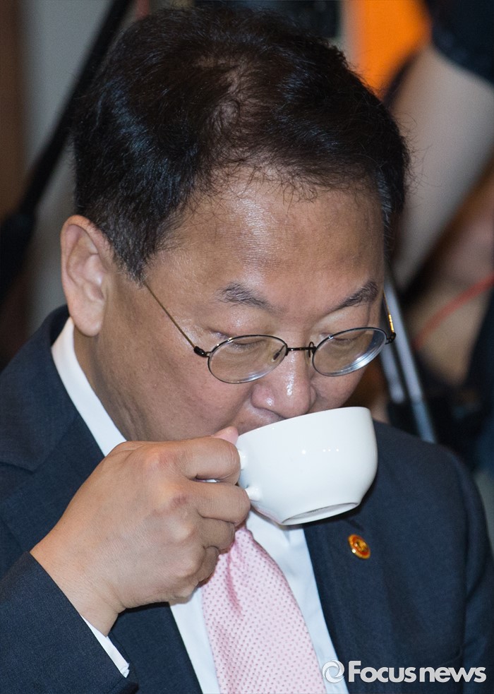 (서울=포커스뉴스) 유일호 경제부총리 겸 기획재정부 장관이 27일 오전 서울 중구 신라호텔 영빈관에서 열린 제14차 한중경제장관회의에 참석해 커피를 마시고 있다.