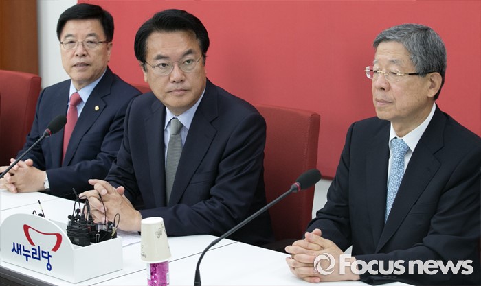 (서울=포커스뉴스) 정진석(가운데) 새누리당 원내대표와 김희옥(오른쪽) 혁신비대위원장 내정자가 27일 오전 서울 여의도 국회에서 원내지도부와의 상견례 자리에 참석해 자리하고 있다.