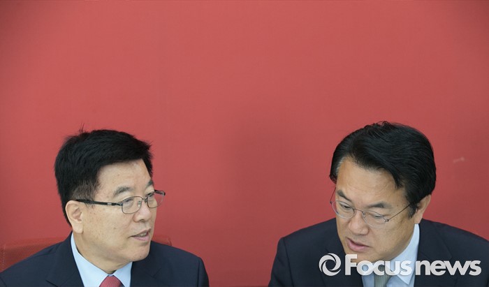 (서울=포커스뉴스) 정진석(오른쪽) 새누리당 원내대표와 김광림 정책위의장이 27일 오전 서울 여의도 국회에서 김희옥 혁신비대위원장 내정자와 원내지도부의 상견례 자리에 참석해 대화하고 있다.