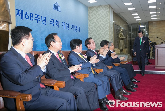 (서울=포커스뉴스) 27일 오전 서울 여의도 국회에서 열린 68주년 국회 개원 기념식에 참석한 정의화(오른쪽 첫번째) 국회의장이 기념사를 통해 정부가 상시 청문회법 등이 포함된 국회법 개정안 재의 요구안을 의결한 것과 관련 입장을 전한 뒤 단상을 내려오고 있다.