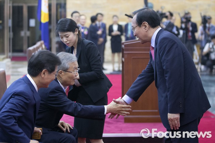 (서울=포커스뉴스) 27일 오전 서울 여의도 국회에서 열린 68주년 국회 개원 기념식에 참석한 노회찬(오른쪽부터) 정의당 원내대표, 김종인 더불어민주당 비대위 대표, 천정배 국민의당 공동대표가 인사하고 있다.