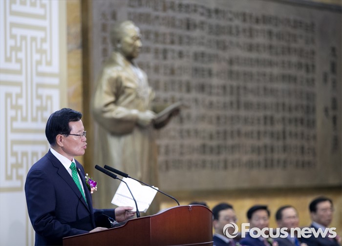 (서울=포커스뉴스) 27일 오전 서울 여의도 국회에서 열린 68주년 국회 개원 기념식에 참석한 정의화 국회의장이 기념사를 통해 정부가 상시 청문회법 등이 포함된 국회법 개정안 재의 요구안을 의결한 것과 관련 헌법 및 국회관계법 책을 들고 입장을 전하고 있다.