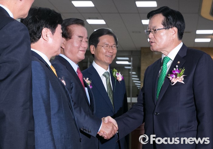 (서울=포커스뉴스) 27일 오전 서울 여의도 국회에서 68주년 국회 개원 기념식을 마친 정의화 국회의장이 정당 참석자들과 인사하고 있다. 오른쪽부터 정 의장, 천정배 국민의당 공동대표, 정갑윤, 이석현 국회 부의장.