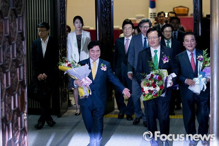 (서울=포커스뉴스) 27일 오전 서울 여의도 국회에서 68주년 국회 개원 기념식을 마친 정의화(가운데) 국회의장이 본회의장에서 정갑윤(오른쪽), 이석현 국회 부의장 등 직원들과 함께 기념촬영 후 나서고 있다.