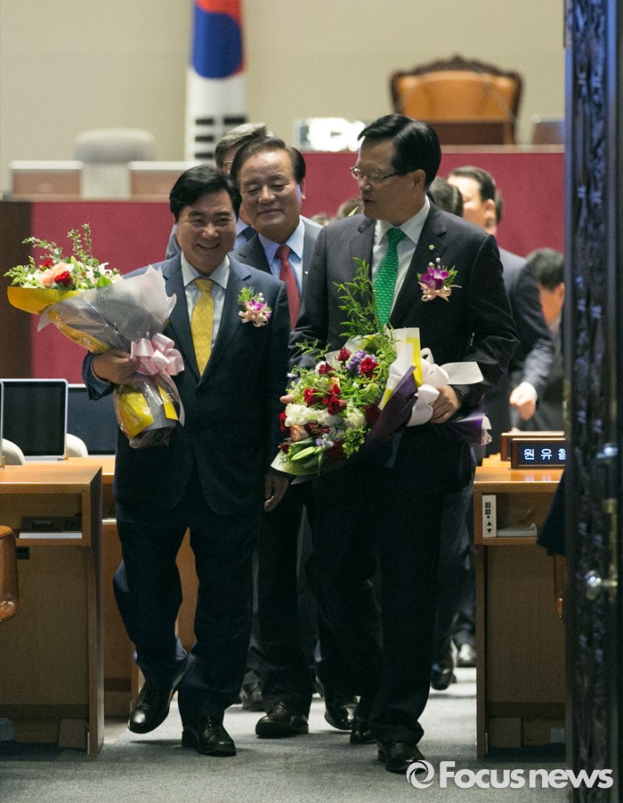 (서울=포커스뉴스) 27일 오전 서울 여의도 국회에서 68주년 국회 개원 기념식을 마친 정의화(오른쪽) 국회의장이 본회의장에서 정갑윤(가운데), 이석현 국회 부의장 등 직원들과 함께 기념촬영 후 나서고 있다.
