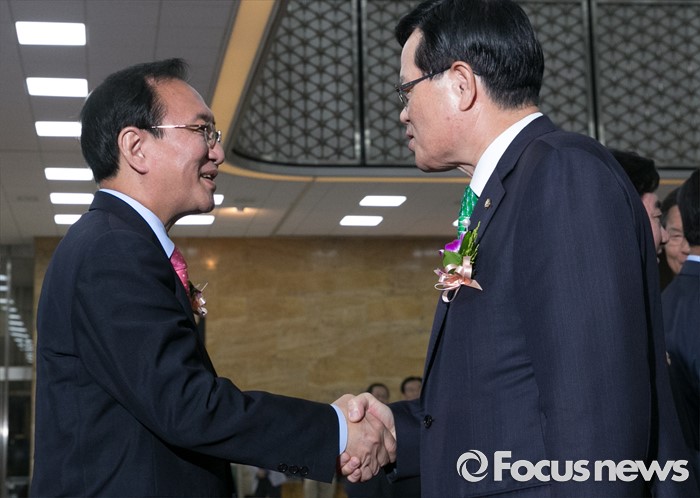 (서울=포커스뉴스) 27일 오전 서울 여의도 국회에서 68주년 국회 개원 기념식을 마친 정의화(오른쪽) 국회의장이 노회찬 정의당 원내대표와 인사하고 있다.