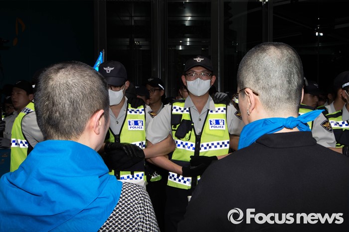 (서울=포커스뉴스) 27일 오전 서울시청 정문앞에서 전국장애인 부모연대와 서울특수학교학부모협의회원들이 발달장애인 정책 수립을 촉구하며 삭발식을 한 뒤 머리카락을 서울시에 전달하기 위해 경찰과 대치하고 있다.