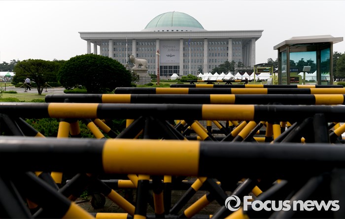 (서울=포커스뉴스) 정부가 상시 청문회 등의 내용이 포함된 국회법 개정안에 대해 거부권을 행사해 여야가 입장 차이를 보이고 있는 27일 오후 서울 여의도 국회 정문 바리케이트 너머로 본청이 보이고 있다.