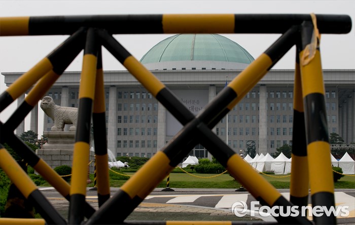 (서울=포커스뉴스) 정부가 상시 청문회 등의 내용이 포함된 국회법 개정안에 대해 거부권을 행사해 여야가 입장 차이를 보이고 있는 27일 오후 서울 여의도 국회 정문 바리케이트 너머로 본청이 보이고 있다.