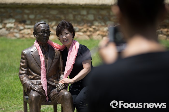 (음성=포커스뉴스) 관광객들이 27일 오후 충북 음성군 원남면 반기문 UN사무총장 생가 앞에 설치된 동상과 기념촬영하고 있다.