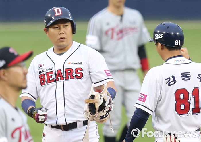 (서울=포커스뉴스) 27일 서울 잠실구장에서 열린 2016프로야구 LG-두산 경기 1회말 2사 1,2루에서 두산 양의지가 2타점 좌중간 2루타를 치고 강동우 코치의 축하를 받고 있다.