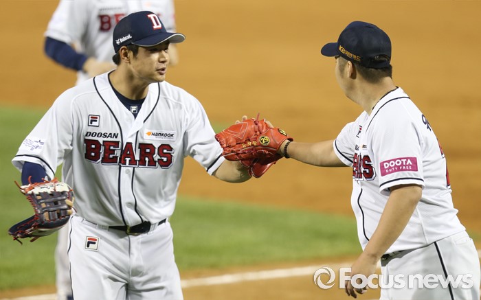 (서울=포커스뉴스) 27일 서울 잠실구장에서 열린 2016프로야구 LG-두산 경기에서 두산 투수 유희관이 5회초 수비를 마치고 덕아웃으로 들어오는 좌익수 김재환과 글러브를 마주치고 있다.