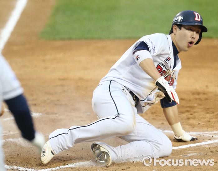 (서울=포커스뉴스) 27일 서울 잠실구장에서 열린 2016프로야구 LG-두산 경기 2회말 2사후 중전 안타로 진루한 두산 박건우가 2루 도루후 최주환의 좌전 안타때 홈인하고 있다.