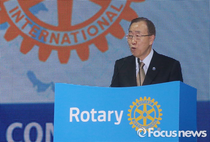 (서울=포커스뉴스) 반기문 유엔 사무총장이 29일 오전 경기 고양시 킨텍스 제1전시장에서 열린 2016 국제로타리 세계대회에 참석해 기조연설 하고 있다.