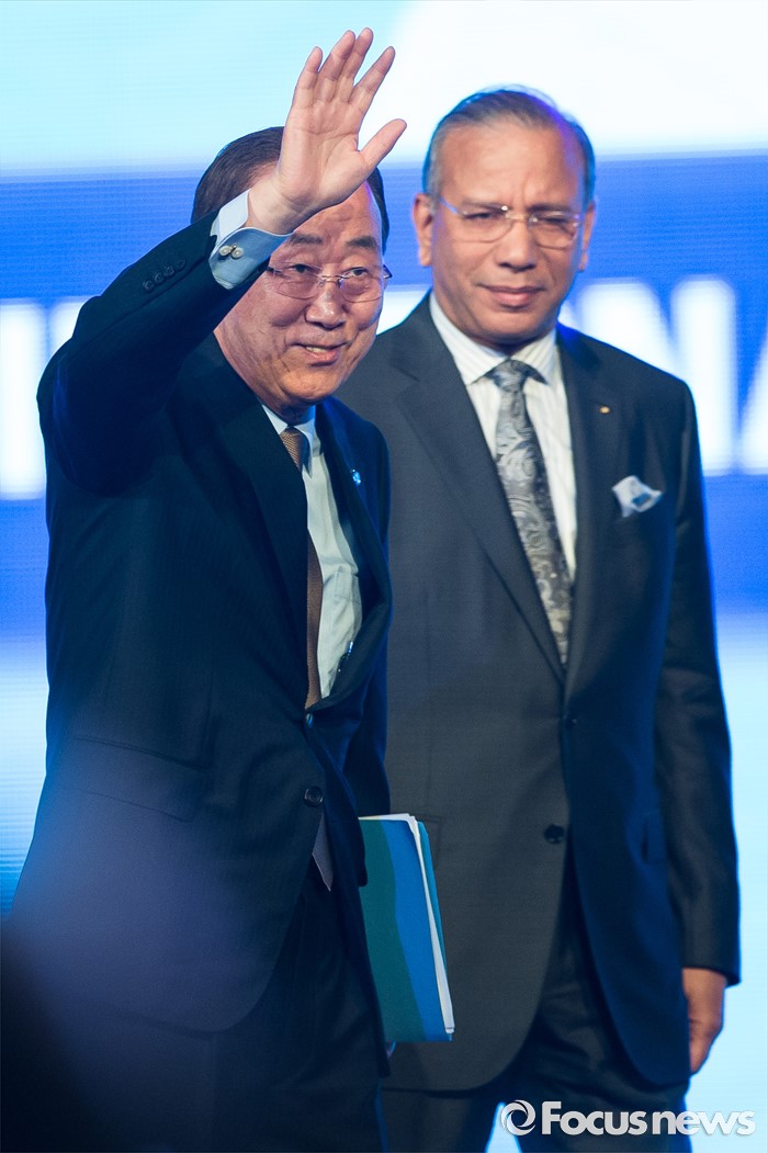 (서울=포커스뉴스) 반기문(왼쪽) 유엔 사무총장이 29일 오전 경기 고양시 킨텍스 제1전시장에서 열린 2016 국제로타리 세계대회에 참석해 기조연설을 마친 후 손을 흔들고 있다. 오른쪽은 K.R. 라빈드란 국제로타리 회장.