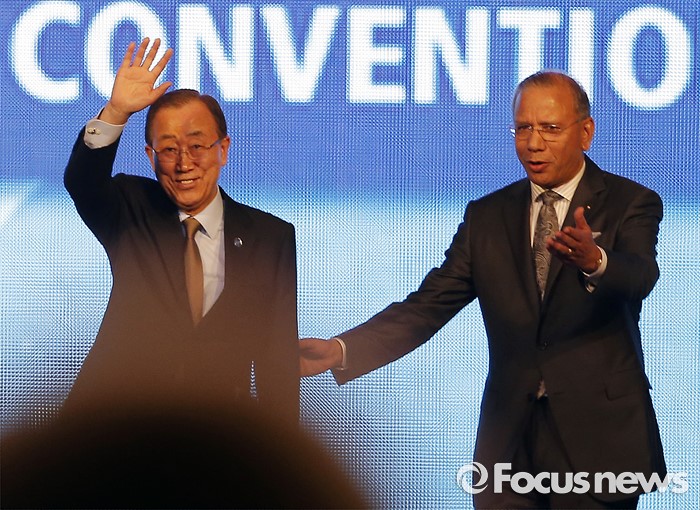 (서울=포커스뉴스) 반기문(왼쪽) 유엔 사무총장이 29일 오전 경기 고양시 킨텍스 제1전시장에서 열린 2016 국제로타리 세계대회에 참석해 인사하고 있다. 오른쪽은 K.R. 라빈드란 국제로타리 회장.