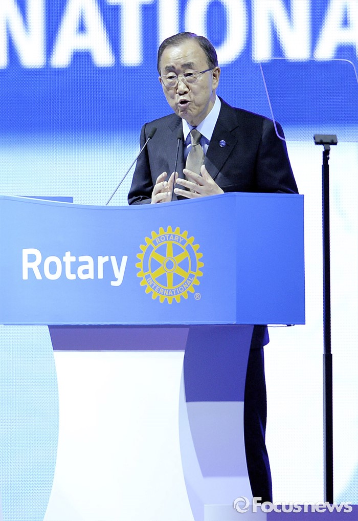 (서울=포커스뉴스) 반기문 유엔 사무총장이 29일 오전 경기 고양시 킨텍스 제1전시장에서 열린 2016 국제로타리 세계대회에 참석해 기조연설 하고 있다.