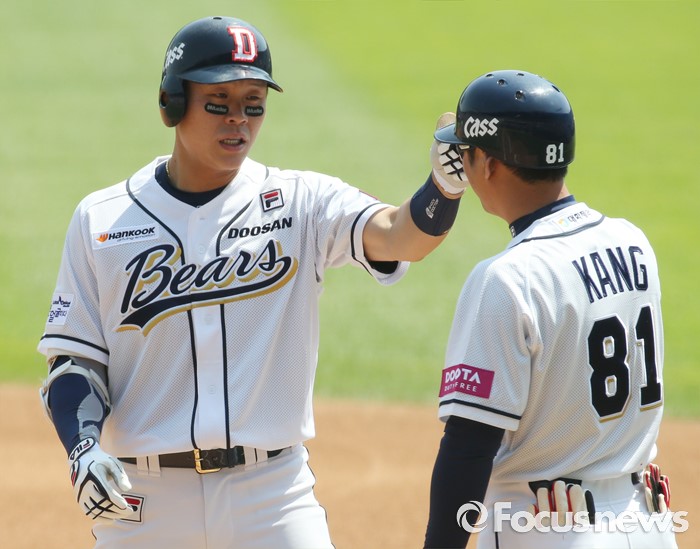 (서울=포커스뉴스) 29일 서울 잠실구장에서 열린 2016프로야구 LG-두산 경기 1회말 2사 1,3루에서 두산 박세혁이 우중간 적시 안타를 치고 강동우 코치의 축하를 받고 있다.