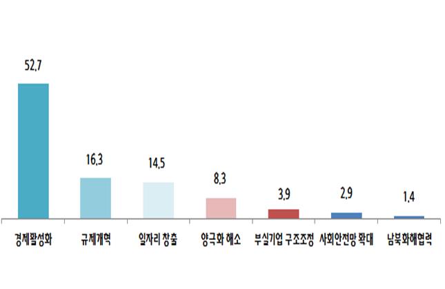 이에 따르면, 중소기업 CEO들은 20대 국회가 가장 우선 처리해야 할 입법분야로 경제활성화(52.7%)를 꼽았다. 또 규제개혁(16.3%)과 일자리창출(14.5%)이 뒤를 이었다.