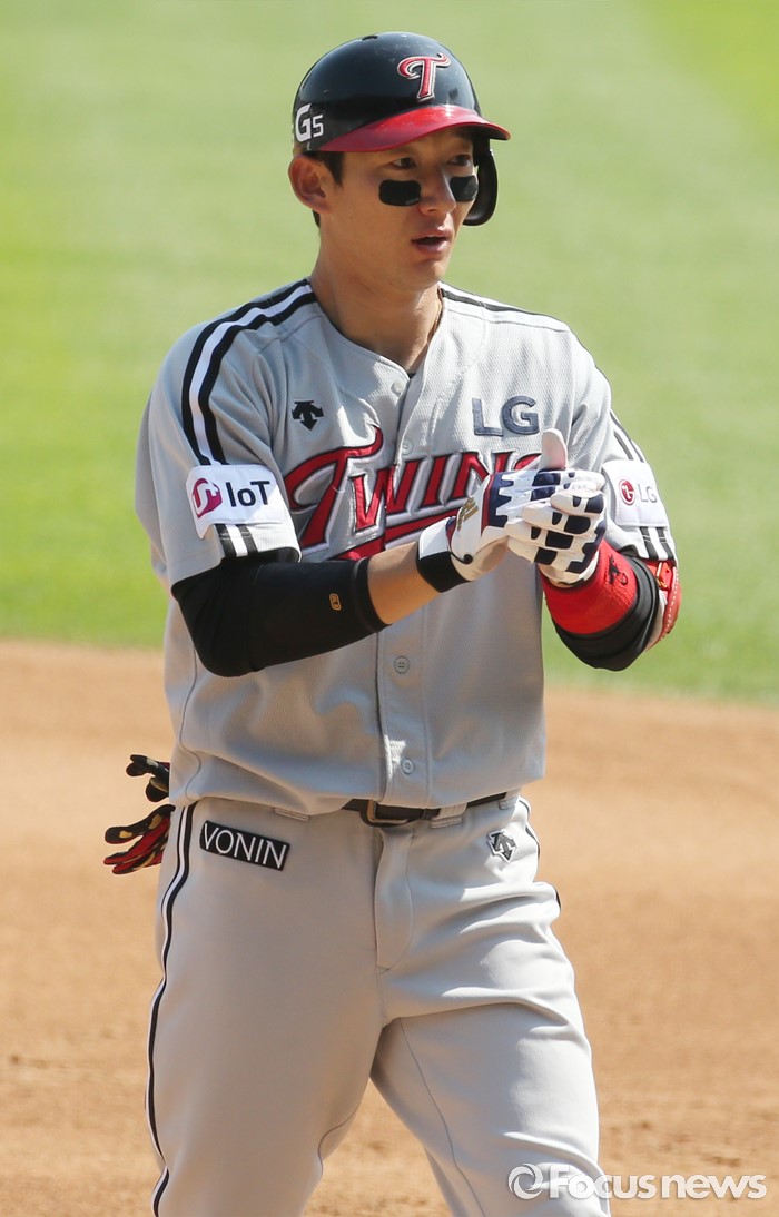 (서울=포커스뉴스) 29일 서울 잠실구장에서 열린 2016프로야구 LG-두산 경기 3회초 2사 1,3루에서 LG 손주인이 우중간 동점 안타를 치고 박수를 치며 기뻐하고 있다.