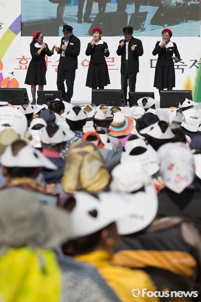 (서울=포커스뉴스) 정세균(오른쪽 두번쨰) 더불어민주당 의원과 김영종(왼쪽 두번째) 종로구청장을 비롯한 참석자들이 29일 오후 서울 종로구 교동초등학교에서 열린 '2016 효자손 어르신 대축제'에 참석해 옛 고등학교 교복과 모자를 쓰고 노래를 부르고 있다.