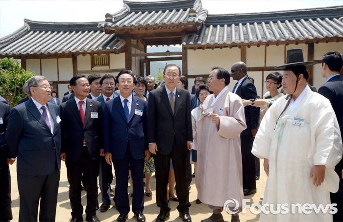 (안동=포커스뉴스) 반기문(가운데) 유엔 사무총장이 29일 오후 경북 안동시 하회마을 방문해 양진당을 둘러보고 있다.