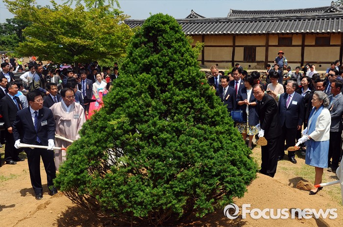 (안동=포커스뉴스) 반기문 유엔 사무총장(오른쪽 두번째) 내외가 29일 오후 유네스코 세계문화유산으로 등재된 경북 안동 하회마을을 방문해 기념 식수를 하고 있다.